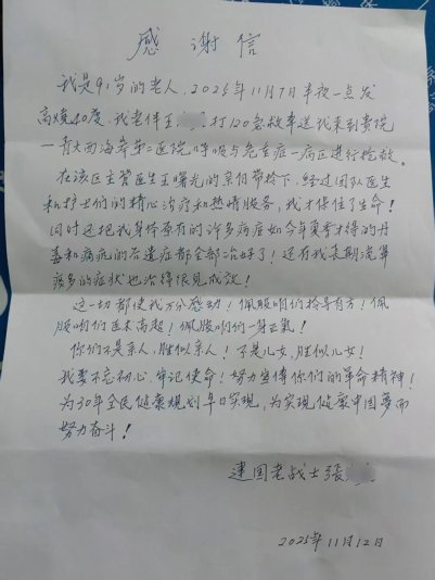 九旬老战士手写感谢信,点赞青岛西海岸第二医院呼吸与危重症医学科团队!