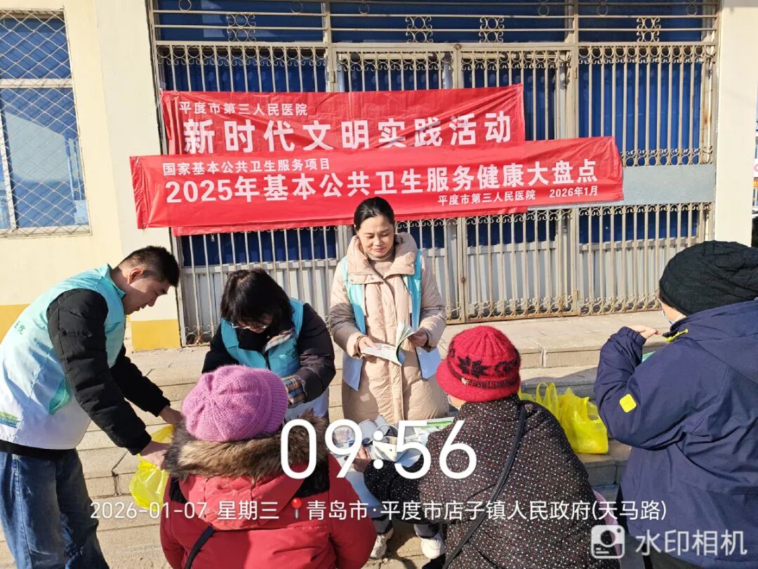 寒冬腊月,暖意不减。2026年1月7日上午,平度市第三人民医院公共卫生科走进店子党委广场,成功开展“2025年基本公共卫生服务健康大盘点”活动,用贴心举措为辖区居民的健康保驾护航,累计吸引90位居民积