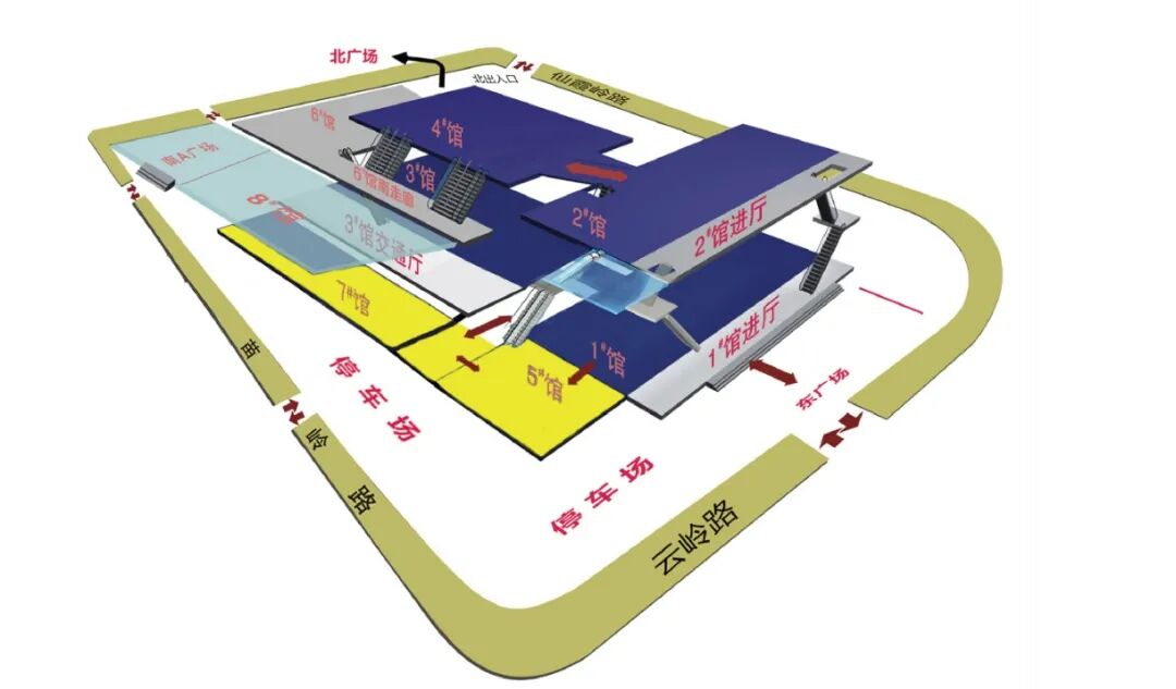 观众入口位于云岭路一号馆东门、苗岭路六号馆南门