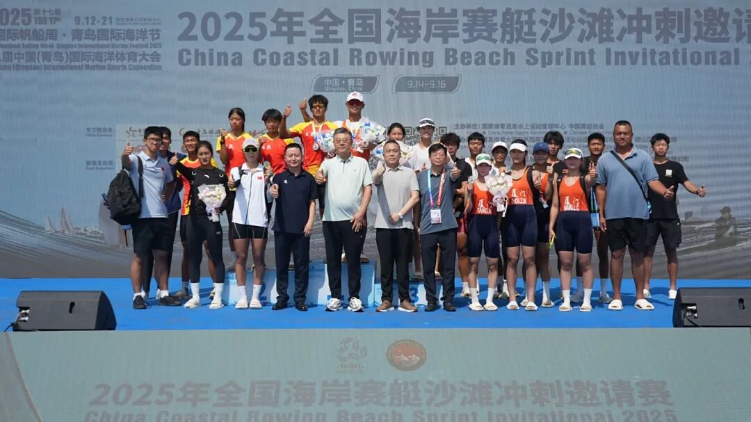 9月16日上午,2025年全国海岸赛艇沙滩冲刺邀请赛在青岛市崂山区石老人海水浴场顺利收官。